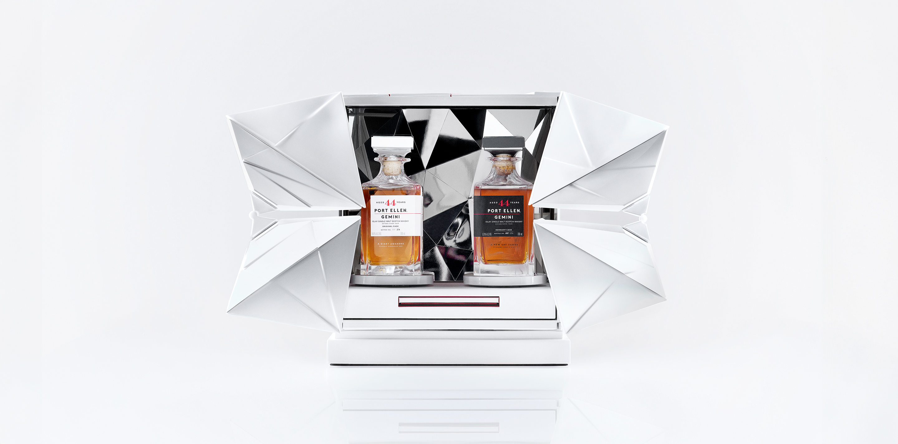 Presented in an unfolding, mirrored case, Port Ellen Gemini holds two 70cl crystal decanters featuring sections of each of the treasured casks that nurtured this precious Single Malt within the stoppers. Only 274 sets will be available at a recommended retail price of £45,000 inclusive of UK VAT and Duty. Contact our team to learn more about acquiring this highly limited release.