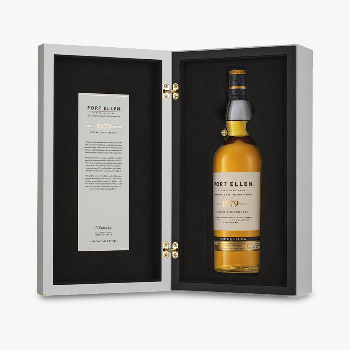 Distilled in 1979, at 40 years old this natural cask strength Port Ellen has been drawn entirely from one cask, number 6422. The Port Ellen distillery closed in 1983, yet its single malt was later revealed to age wonderfully; this superb example is subtle, elegant and flavourful after forty years. From one of the very last 1979 European Oak butts, this Port Ellen expresses, to the full, the wonderful balance between sweetness, saltiness and smokiness that characterises Port Ellen.